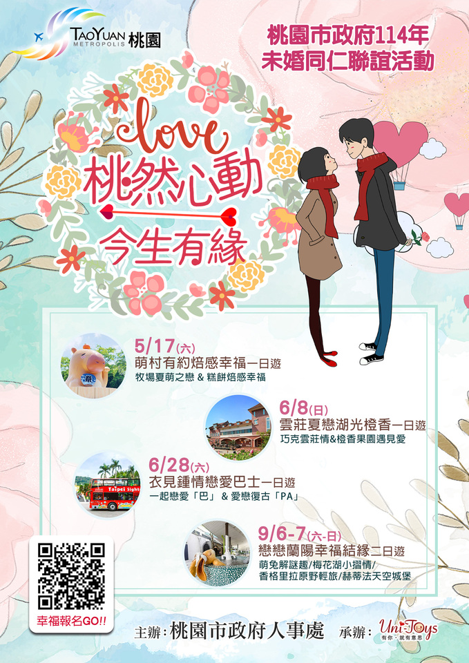 主旨:桃園市政府114年「桃然心動 今生有緣」未婚同仁聯誼活動調整至114年9月6日及7日辦理一案,請查照並鼓勵符合資格之未婚單身同仁踴躍報名參加。